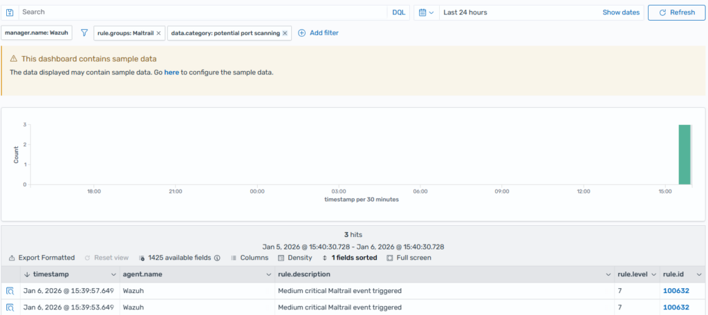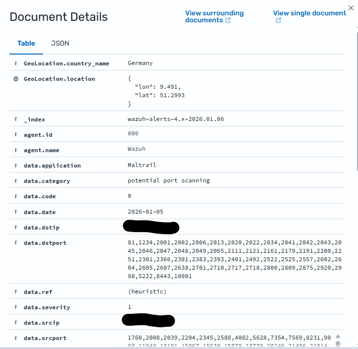 Typisch ist dann eine Einordnung in eine Rule-Group wie z. B. Maltrail und ein Feld wie data.category, das den Erkennungstyp transportiert (z. B. “potential port scanning”).